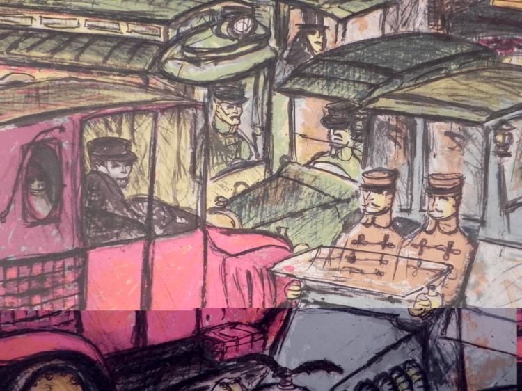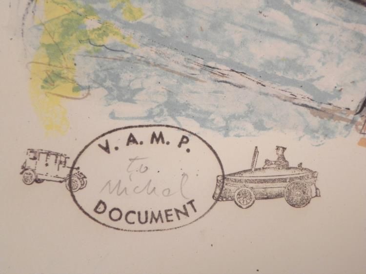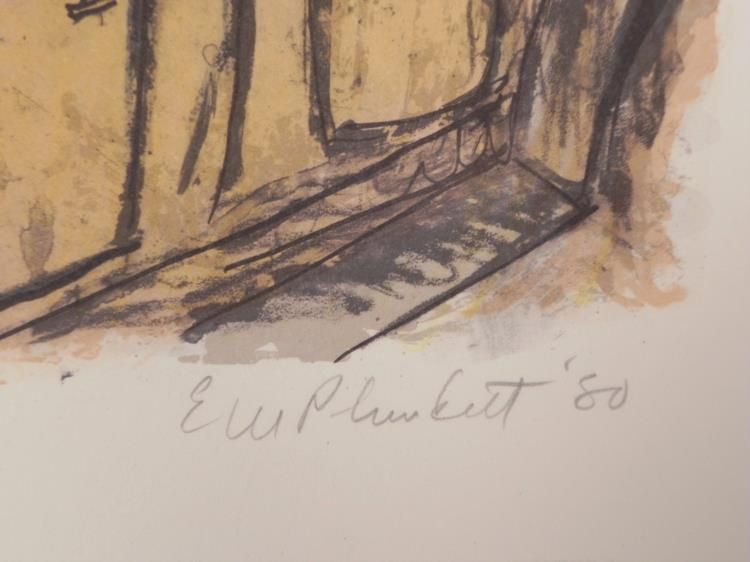 This print evokes humor, and is quite nicely done, portraying an early scene of traffic congestion in a colorful conglomeration. Artist: Edward Plunkett Signature: "Edward Plunkett" in pencil, lower right Medium: Lithograph on rag paper Edition: Unnumbered, dedicated artist proof, stamped V.A.M.P. DOCUMENT marked in pencil inside "To Michel" Sheet size: 19 x 26 inches Condition: Excellent Biography:Edward Plunkett (1922- ) Edward M. Plunkett was born in Michigan, and studied art at the University of Chicago, the School of the Chicago Art Institute, The Institute of Fine Arts and then at the Sorbonne in Paris. Plunkett went on to teach at The Chicago Art Institute. His style is a unique form of surrealism and fantasy. His paintings have been shown at The Whitney Museum in New York, and The Museum of Modern Art in Paris. His work can be found in many fine collections including The Metropolitan Museum of Art in New York. We are pleased to present from an estate a group of dedicated artist proofs.