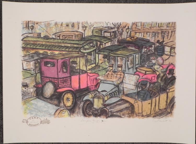 This print evokes humor, and is quite nicely done, portraying an early scene of traffic congestion in a colorful conglomeration. Artist: Edward Plunkett Signature: "Edward Plunkett" in pencil, lower right Medium: Lithograph on rag paper Edition: Unnumbered, dedicated artist proof, stamped V.A.M.P. DOCUMENT marked in pencil inside "To Michel" Sheet size: 19 x 26 inches Condition: Excellent Biography:Edward Plunkett (1922- ) Edward M. Plunkett was born in Michigan, and studied art at the University of Chicago, the School of the Chicago Art Institute, The Institute of Fine Arts and then at the Sorbonne in Paris. Plunkett went on to teach at The Chicago Art Institute. His style is a unique form of surrealism and fantasy. His paintings have been shown at The Whitney Museum in New York, and The Museum of Modern Art in Paris. His work can be found in many fine collections including The Metropolitan Museum of Art in New York. We are pleased to present from an estate a group of dedicated artist proofs.