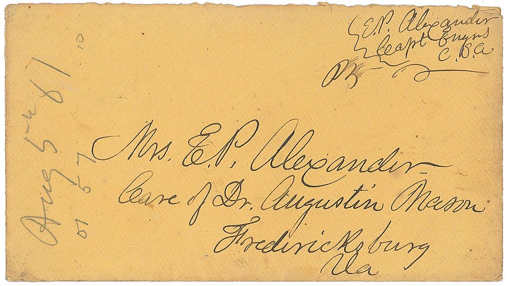 Military engineer (1835–1910) who rose to the rank of brigadier general in the Confederate army. Hand-addressed and free franked mailing envelope, 5.5 x 3, addressed by Alexander to his wife, “Mrs. E. P. Alexander, Care of Dr. Augustine Mason, Fredericksburg, Va,” and franked in the upper right, “E. P. Alexander, Capt. Engrs, C. S. A.” In fine condition, with a pencil notation to left side and scattered light soiling.