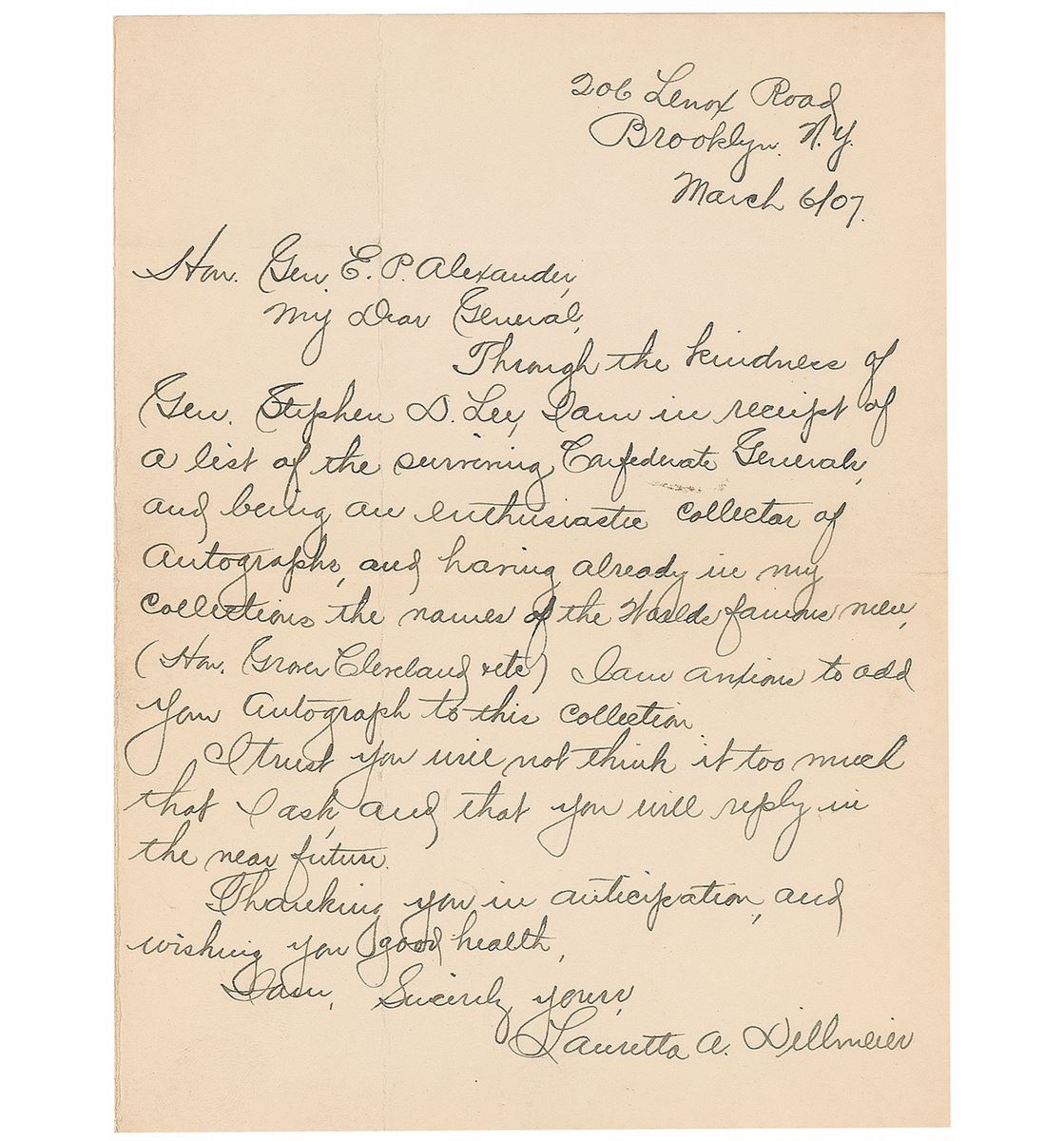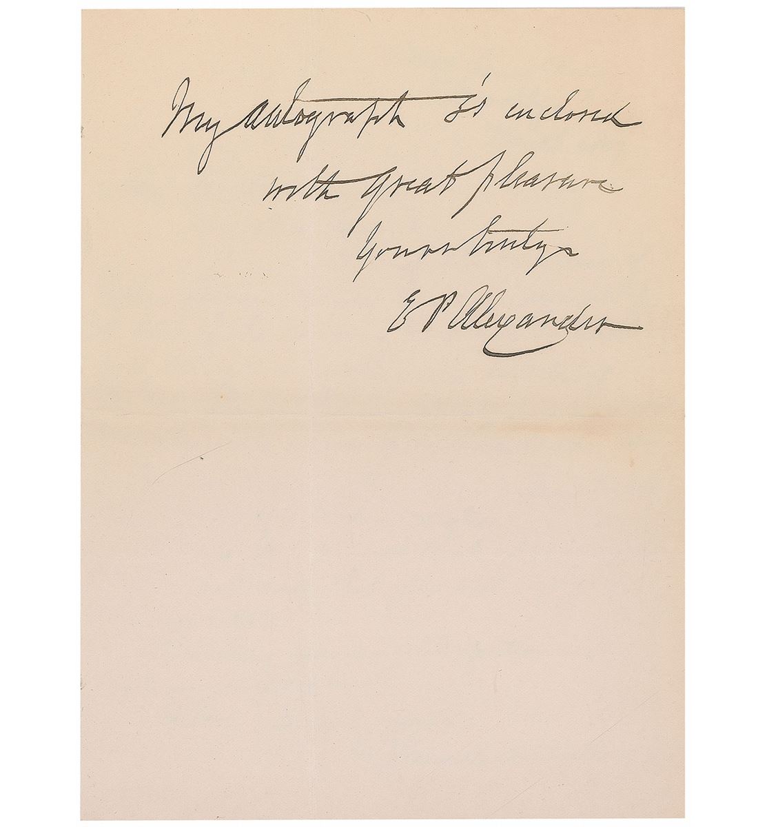 Military engineer (1835–1910) who rose to the rank of brigadier general in the Confederate army. ANS signed “E. P. Alexander,” penned on the second integral page of a request sent to him, one page, 5 x 6.75, March 6, 1907. In full: “My autograph is enclosed with great pleasure.” In fine condition, with central vertical and horizontal folds.