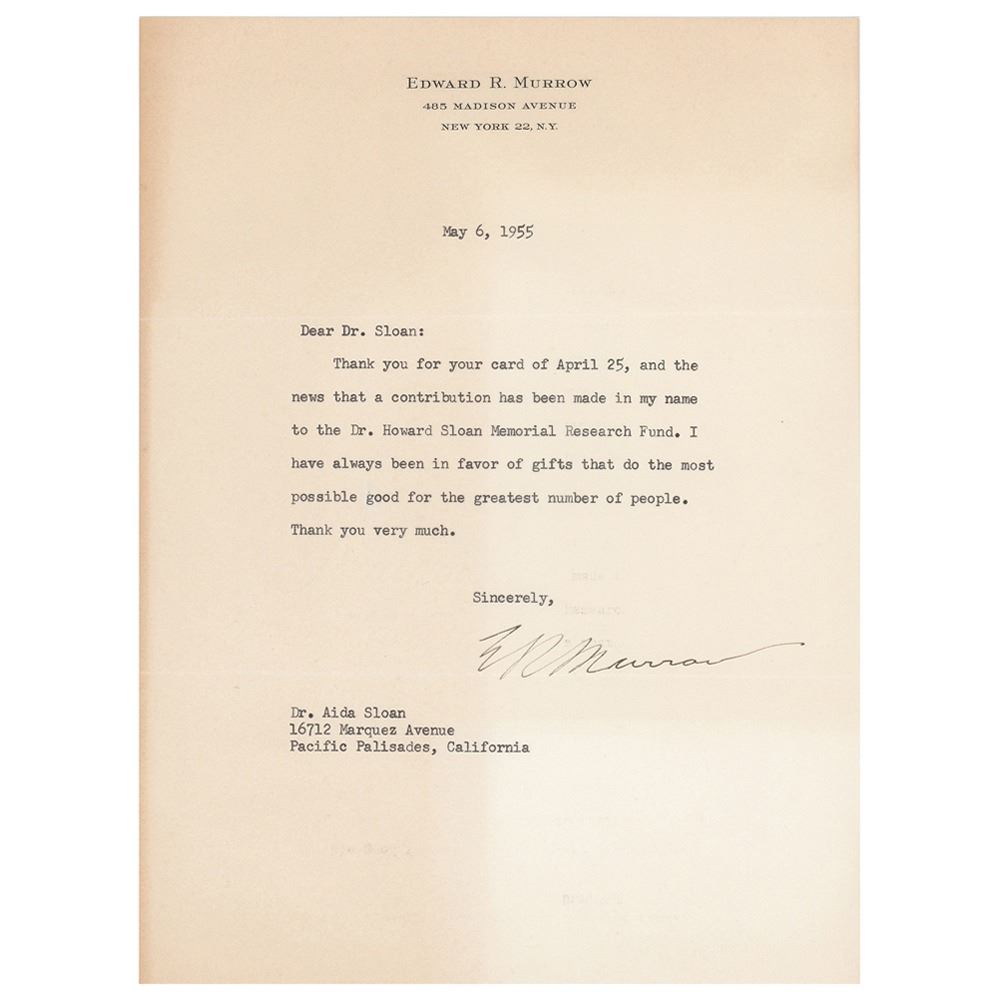 TLS signed “E. R. Murrow,†one page, 7.25 x 9.75, personal letterhead, May 6, 1955. Typed letter to Dr. Aida Sloan, in full: "Thank you for your card of April 25, and the news that contribution has been made in my name to the Dr. Howard Sloan Memorial Research Fund. I have always been in favor of gifts that do the most possible good for the greatest number of people. Thank you very much." In fine condition, with light toning.