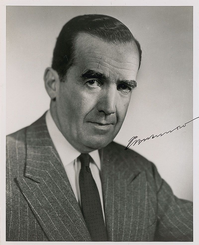 Vintage glossy 8 x 10 portrait of Murrow in a pinstriped suit, signed in black ink, “E. R. Murrow.” Scattered bends and creases, and a stray ink mark to his forehead, otherwise fine condition. Accompanied by the original letter of transmittal from the US Information Agency, dated October 26, 1961.