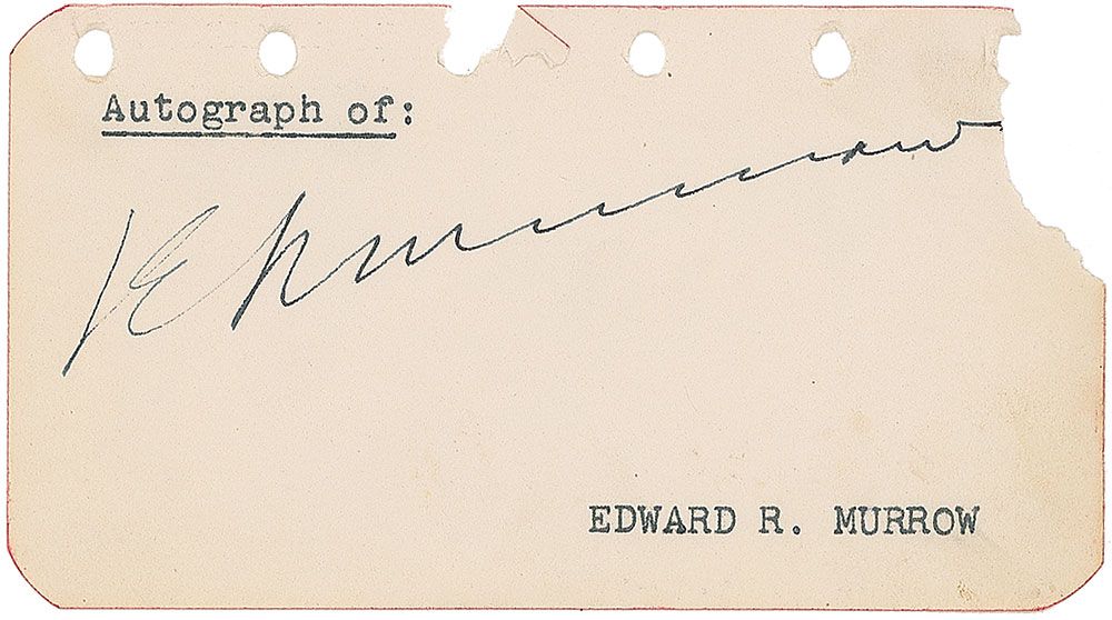 Vintage fountain pen signature, “E. R. Murrow,” on an off-white 4.5 x 2.5 page. In very good condition, with paper loss to the upper right corner (affecting just the very end of the signature).