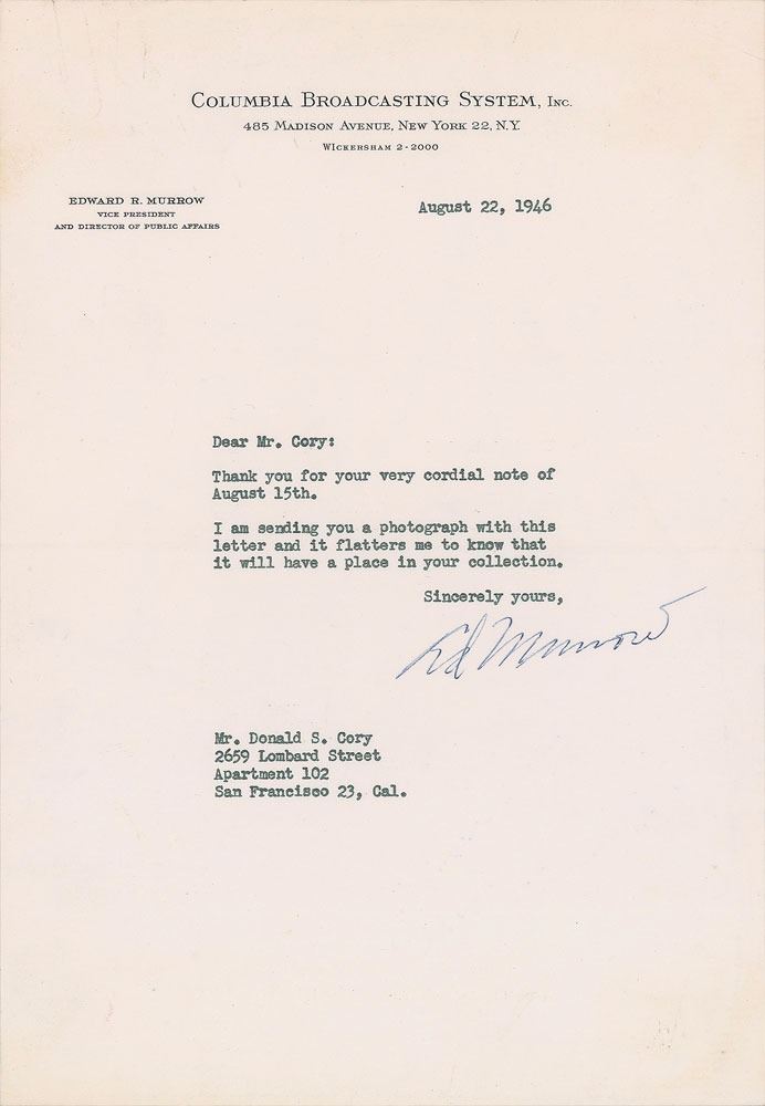 American journalist (1908–1965) best known for his wartime broadcasts from London and his widely respected CBS television news shows See It Now and Person to Person. TLS signed “Ed Murrow,” one page, 7.25 x 10.5, Columbia Broadcasting System letterhead, August 22, 1946. Letter to Donald S. Cory, in part: "I am sending you a photograph with this letter and it flatters me to know that it will have a place in your collection." In fine condition.