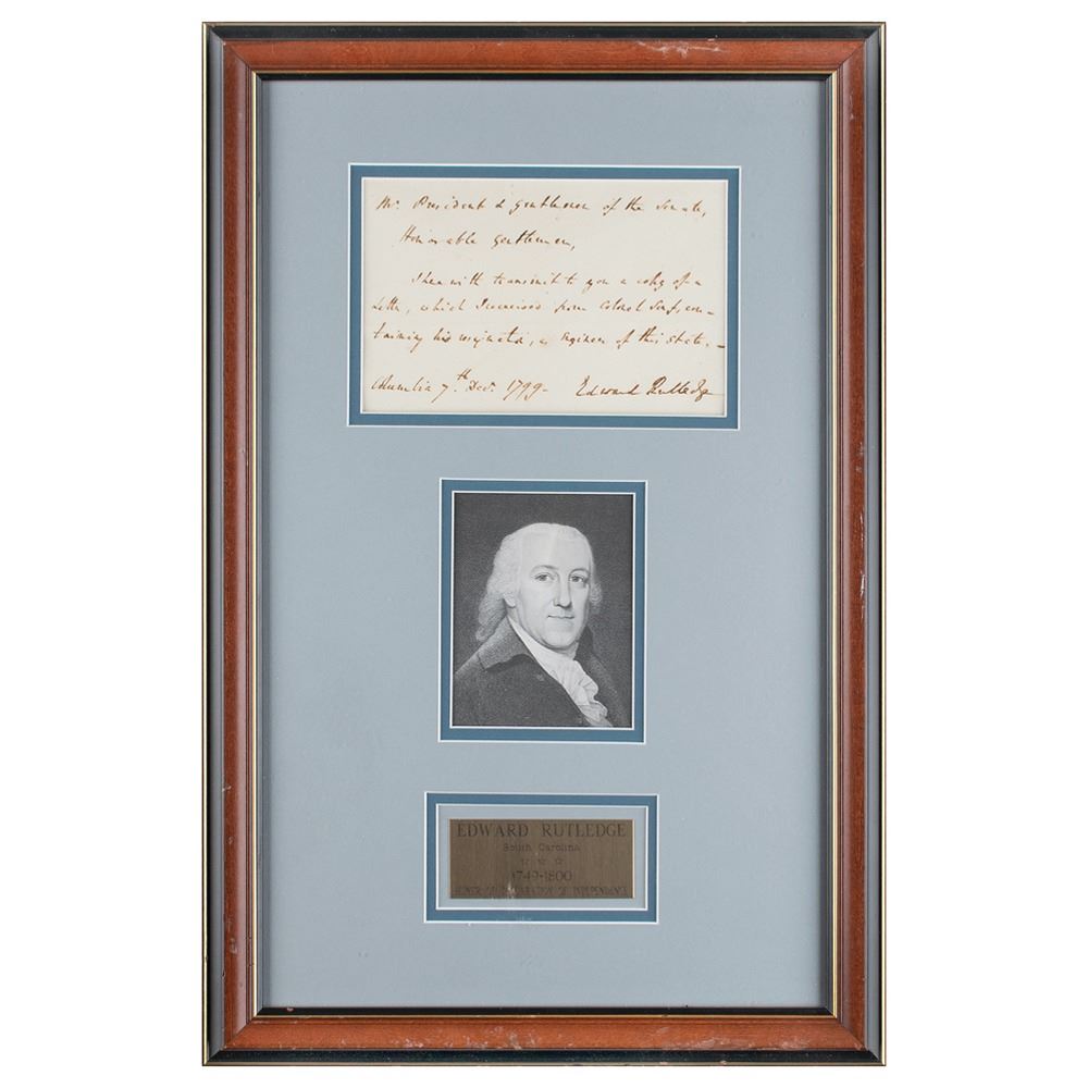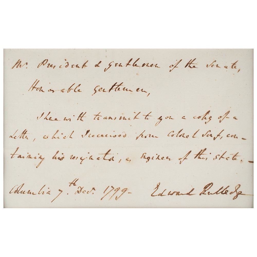 American politician from South Carolina who was the youngest signer of the Declaration of Independence (1749–1800). ALS, one page, 7 x 4.5, December 7, 1799. As governor of South Carolina, Rutledge informs the legislature of the resignation of the state's engineer. In full: "Mr. President & Gentlemen of the Senate: Honorable Gentlemen, I herewith transmit to you a copy of a letter, which I received from Colonel Serf, containing his resignation, as Engineer of this State." Double-matted and framed with an engraved portrait and plaque to an overall size of 13 x 20; the frame's backing has a window for viewing the docketing on the reverse. In fine, clean condition.