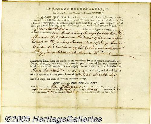 <B>Edward Rutledge, Signer of the Declaration of Independence</B></I> A partly-printed document signed "Edward Rutlege" as Governor of South Carolina on the verso, 16" x 13", Columbia, March 4, 1799. A grant of 400 acres granted to Joel Smith "...Surveyed for him the 11th day of December 1793. Situate in the District of Camden in York County, on the Jumping Branch, Waters of Kings Creek..." With a 7.75" x 9.75" manuscript survey of the property affixed to the verso next to Rutledge's signature. Weak folds expertly repaired with Japanese tissue, tiny pin holes at a few of the fold intersections, otherwise bright and quite clean. <I>From the collection of Bradley O'Leary.</B></I> <I>Accompanied by COA from PSA/DNA.</B></I>