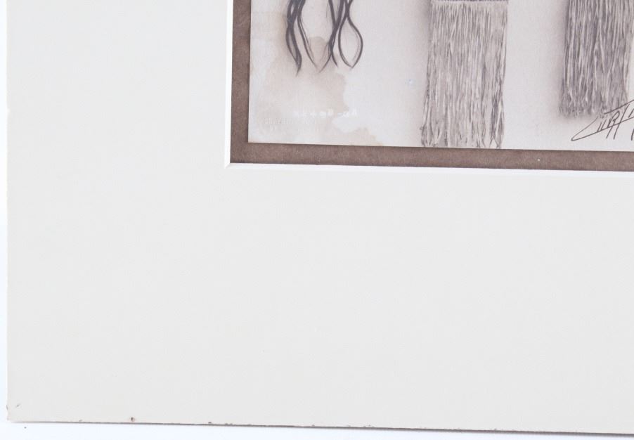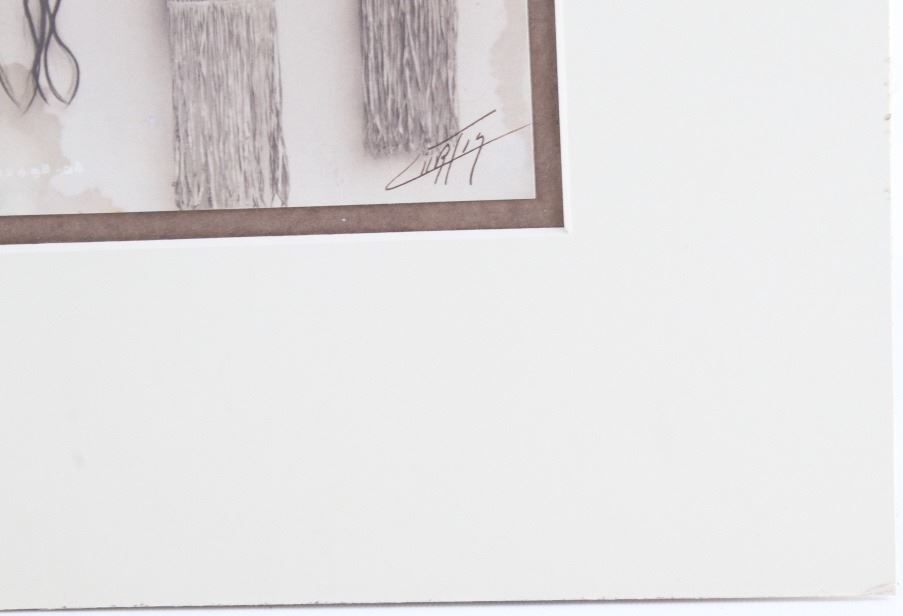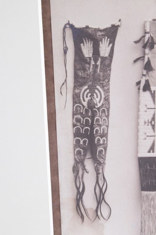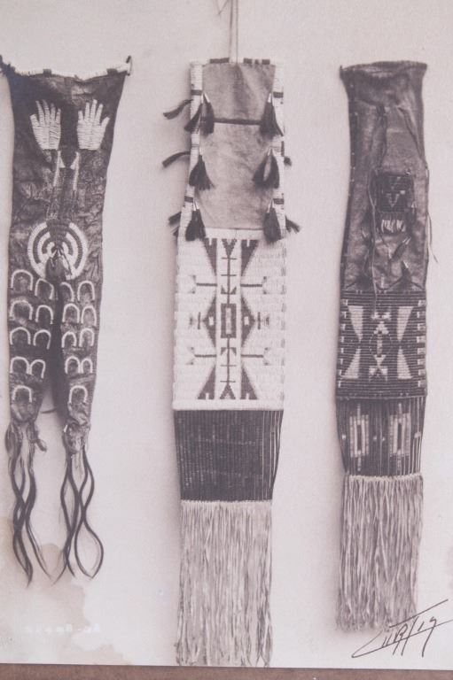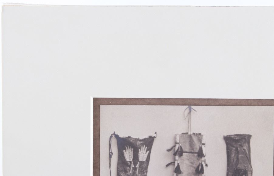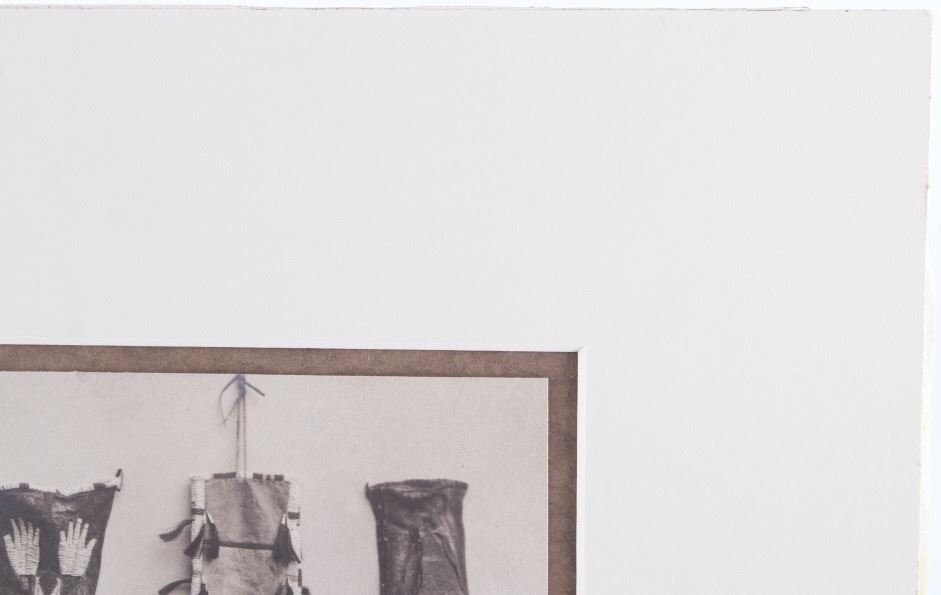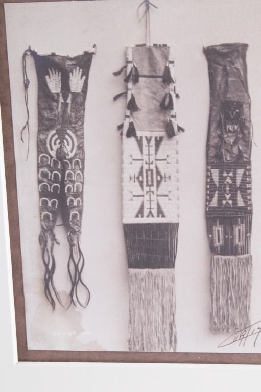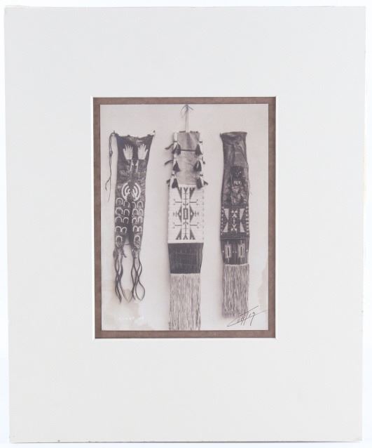 Featured in this lot is this photogravure called "Pipe Bags," circa 1908 by artist Edward S. Curtis born in 1868 and died in 1952. The artwork features a wonderfully and professionally crafted photogravure construction printed on a Japanese vellum paper that features three pipe bags that are highly beaded and shows a variety of lengths of fringe, this is an original photogravure that features the artist hand signed signature in the bottom right hand corner and shows a blind stamp in the bottom left hand corner that reads as follows: Copyrighted 1908 by E.S. Curtis. The photogravure is also marked above the blind stamp 'X2498-08.' Edward Sheriff Curtis was born in February, 1868 in White Water, Wisconsin. The Curtis family moved soon thereafter to Minnesota, and he grew up near the Chippewa, Menomini, and Winnebago Indian tribes. Curtis' interest in photography started in his teens when he built his own crude cameras and taught himself photography from self-help guides. Edward Sherriff Curtis was an American photographer and ethnologist whose work focused on the American West and on Native American people. The condition of this original photogravure is fair to good with some slight staining to the right hand side of the print and to the left bottom corner of the print but otherwise shows fair to good overall condition. The measurements of this bordered original print is 15" x 12 3/8" the visible art measures 7 7/8" x 5 3/4". Provenance: From the renowned Sundog Fine Art Bozeman, Montana collection and collected by Bruce VanLandingham. Bruce VanLandingham was a pillar in the American Indian collecting community and a respected expert. Along with being an avid collector, Bruce also was the sole owner of Sundog Fine Art Gallery in Bozeman, which was both part museum and gallery.