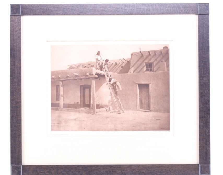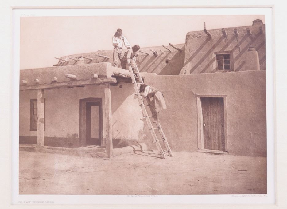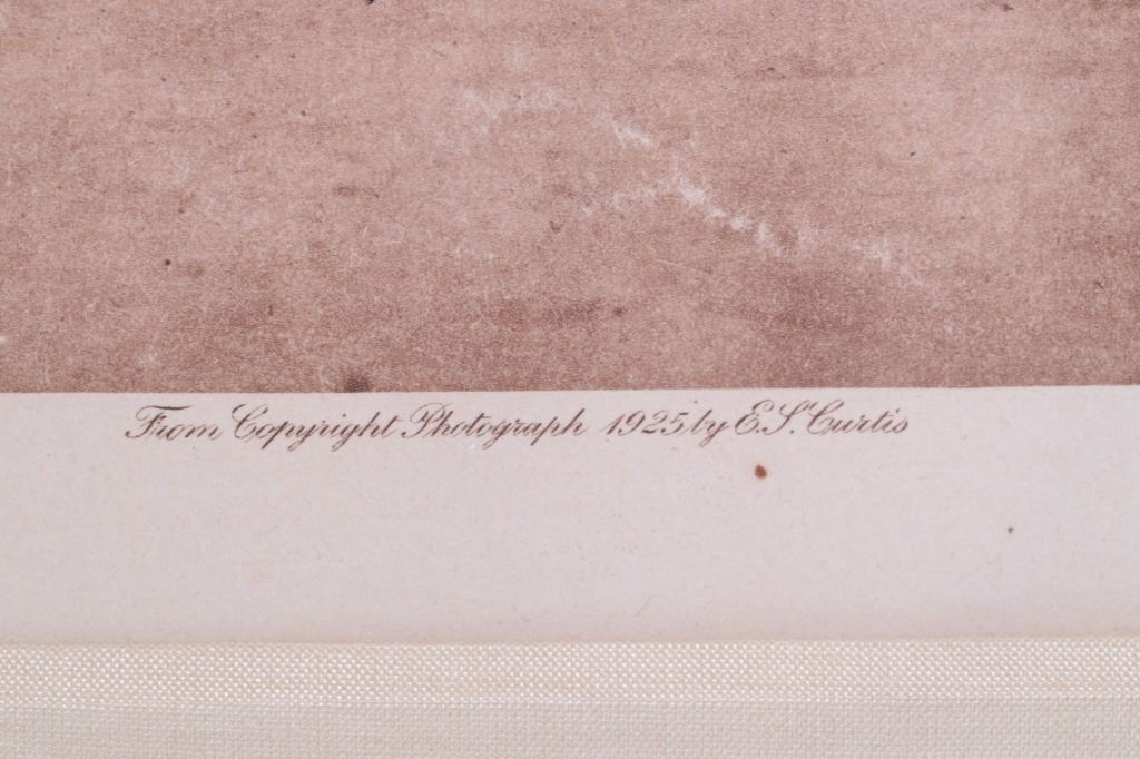 Featured in this lot is an original, circa 1925 photograph photogravure on tissue by Edward Sheriff Curtis (American 1868-1952) titled “In San Ildefonso”. The piece is from etching photogravure Plate 589 by Edward S. Curtis of a San Ildefonso Pueblo, showing three men; it was published from Suffolk Engraving Co. in 1925. The title is shown in the bottom left-hand corner of the photograph and the plate number is in the top left hand corner. Edward Sheriff Curtis was an American photographer and ethnologist whose work focused on the American West and on Native American Peoples. Pictured in “The North American Indian” by Edward S. Curtis in Twenty Two Volumes, the first published in 1907; shown in Volume XVII published 1926 (referenced to Edward S. Curtis, The North American Indian: The Complete Portfolios, published 1997 in Italy Benedikt Taschen Verlag GmbH on page 654). Provenance: From the renowned Sundog Fine Art Bozeman, Montana collection and collected by Bruce VanLandingham. Bruce VanLandingham was a pillar in the American Indian collecting community and a respected expert. Along with being an avid collector, Bruce also was the sole owner of Sundog Fine Art Gallery in Bozeman, which was both part museum and gallery. The condition of this framed photograph is good, with no obvious signs of damage. The measurements of this framed photograph are 22 3/4" x 26 1/2" and the visible art measures 12 1/2" x 16 3/4". Truly a scarcely seen authentic original.