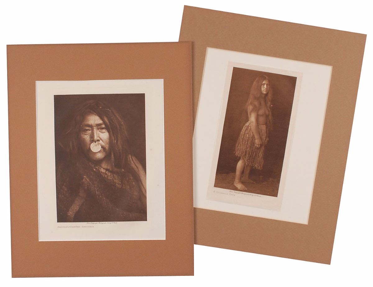 Handsome pairing of photogravures of Native Americans, including: one entitled ‘Naemahlpunkuma-Hahuamis,’ 7.5 x 9.5, captioned along the bottom, ‘From Copyright Photograph 1914 by E. S. Curtis’; and one entitled ‘A Quinalt Type,’ 4.5 x 8.5 and affixed to a larger sheet, captioned along the bottom, ‘From Copyright Photograph 1910 by E. S. Curtis.’ Each is matted to an overall size of 11 x 14. In overall fine condition, with light scattered foxing to the borders of the 1914 image.