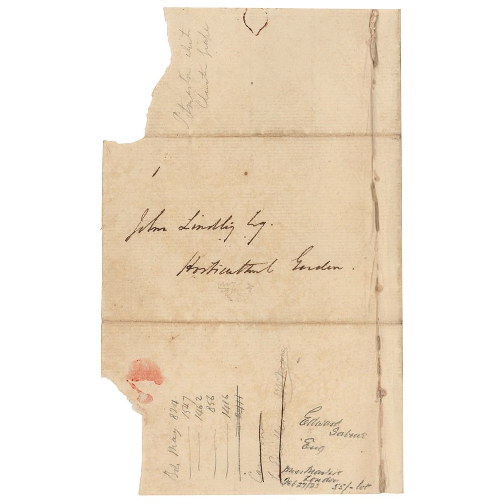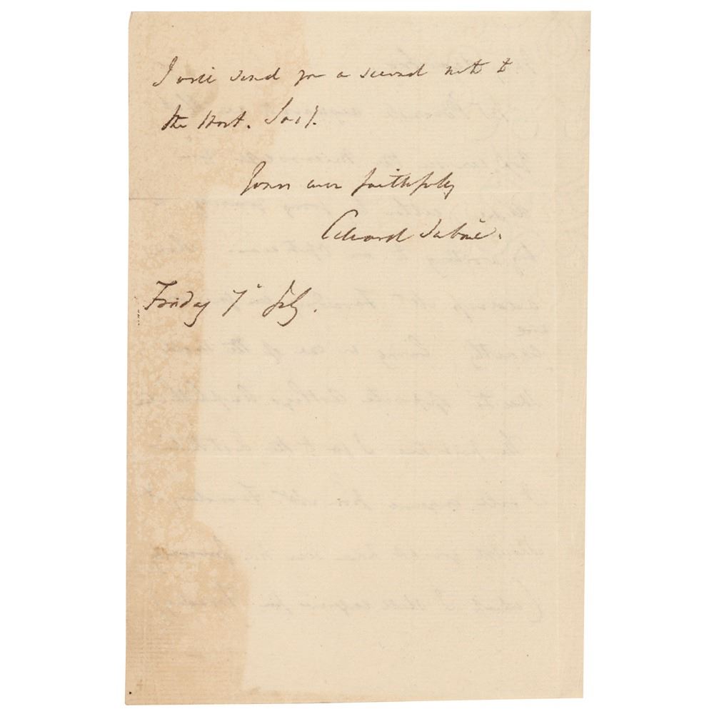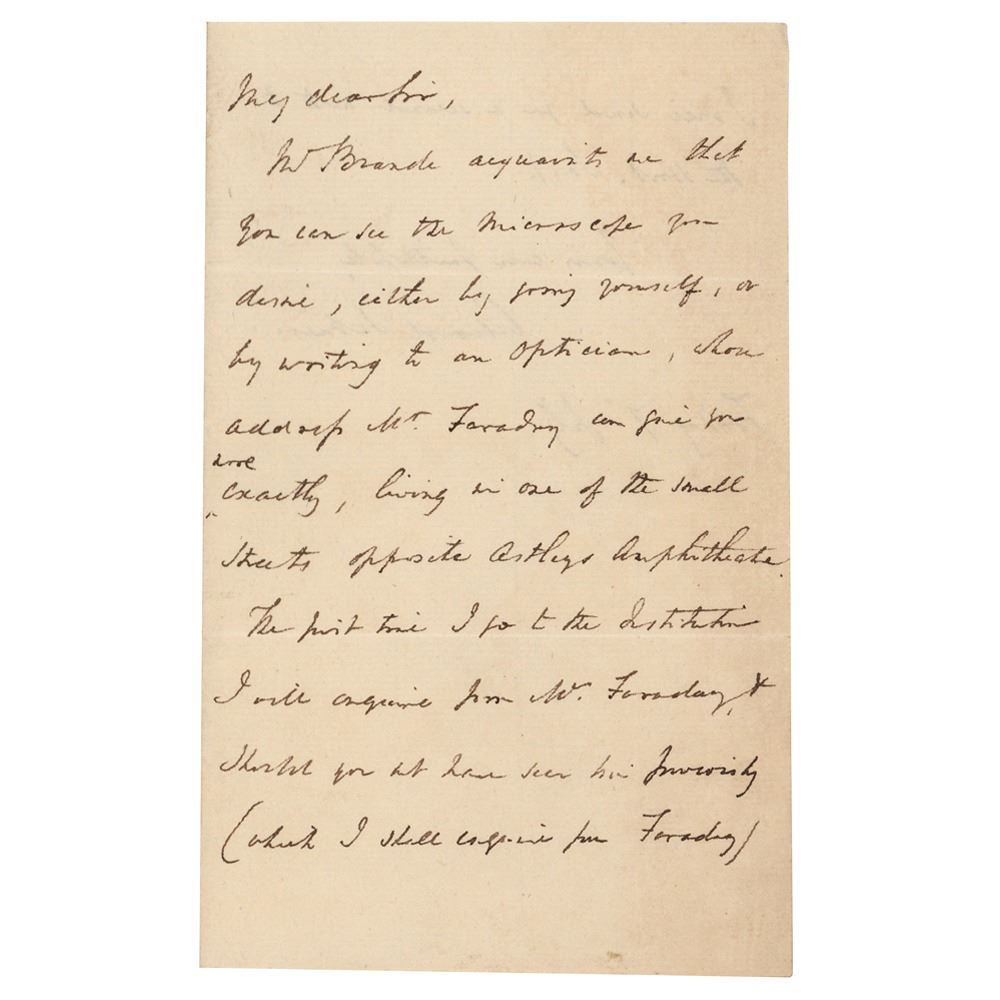 Anglo-Irish astronomer, geophysicist, ornithologist, and explorer (1788-1883) whose most notable work was research on the Earth's magnetic field. ALS, one page both sides, 4.5 x 7.25, July 7. Handwritten letter to botanist John Lindley at the "Horticultural Garden," with reference to the great electromagnetic experimenter Michael Faraday. In part: "Mr. Brande acquaints me that you can see the microscope you desire, either by going yourself, or by writing to an optician, whose address Mr. Faraday can give you more exactly, living in one of the small streets opposite Astley's Amphitheatre. The first time I go to the Institution I will enquire from Mr. Faraday." In fine condition, with light staining, and corner losses and a rusty circular paperclip impression to the integral leaf.