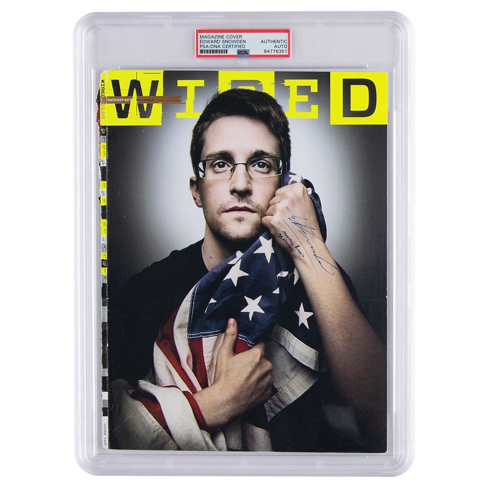 Front cover of Wired magazine from September 2014, which famously depicts Edward Snowden embracing the American flag, 8.25 x 10.75, signed in blue ink, & ldquo;Edward Snowden, Moscow, Russia, 30 Nov. 2015.& rdquo; In fine condition, with light handling wear. Encapsulated in a PSA/DNA authentication holder. Accompanied by the original mailing envelope sent by Snowden& rsquo;s ACLU attorney.