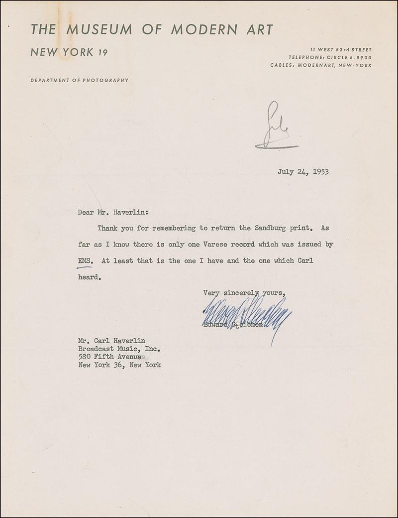 Important photographer (1879–1973) who was one of the pioneering figures in the field of “art” photography. TLS, one page, 8.5 x 11, Museum of Modern Art letterhead, July 24, 1953. Steichen replies to Carl Haverlin of Broadcast Music in New York City. In full: “Thank you for remembering to return the Sandburg print. As far as I know there is only one Varese record which was issued by EMS. At least that is the one I have and the one which Carl heard.” In very good condition, with light wrinkling and creasing, pencil notation at top, and a paperclip impression at the top edge with some rust staining. Accompanied by a copy of the letter written to Steichen. Carl Sandburg was one of America’s most celebrated authors, and Edgard Varese was a pioneer in electronic music.