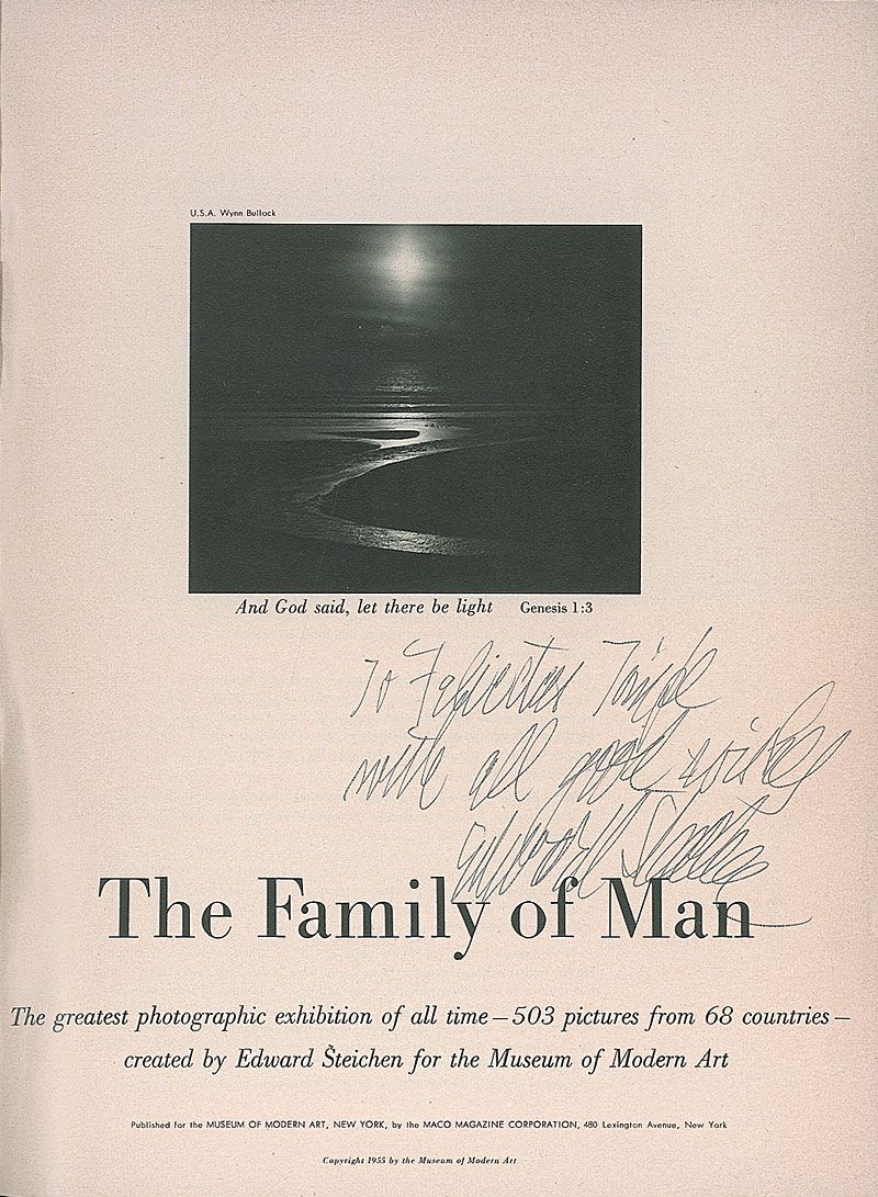 Important photographer (1879–1973) who was one of the pioneering figures in the field of ‘art’ photography. Signed book: The Family of Man. NY: Maco Magazine Corporation, 1953. Softcover, 8.5 x 11, 192 pages. Signed and inscribed on the title page to German photographer Felicitas Simpe. In very good condition, with scattered creases to covers, a few tears and areas of paper loss to spine, and expected handling wear.