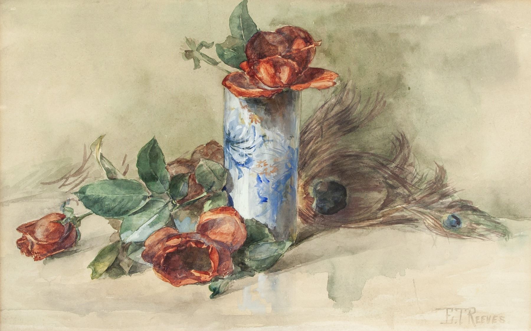 Gouache, still life on paper. Signed E.T. REEVES on the lower right corner, Attributed to Edward T. Reeves. 10.5 x 16.5 inch (26 x 41 cm). PROVENANCE: Upper New York Estate