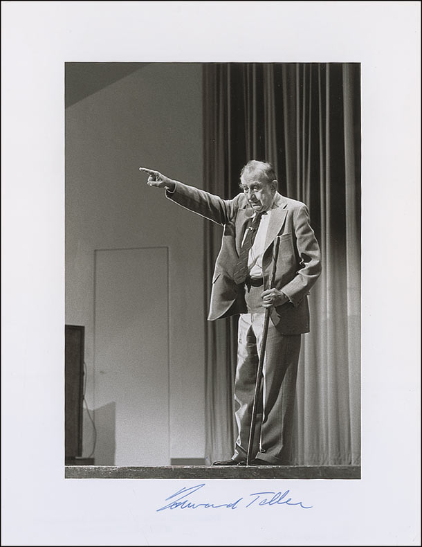Glossy 8.5 x 11 photo of Teller on stage and pointing towards an unseen crowd, signed in the bottom border in blue ballpoint. In fine condition, with light creasing to the corners.