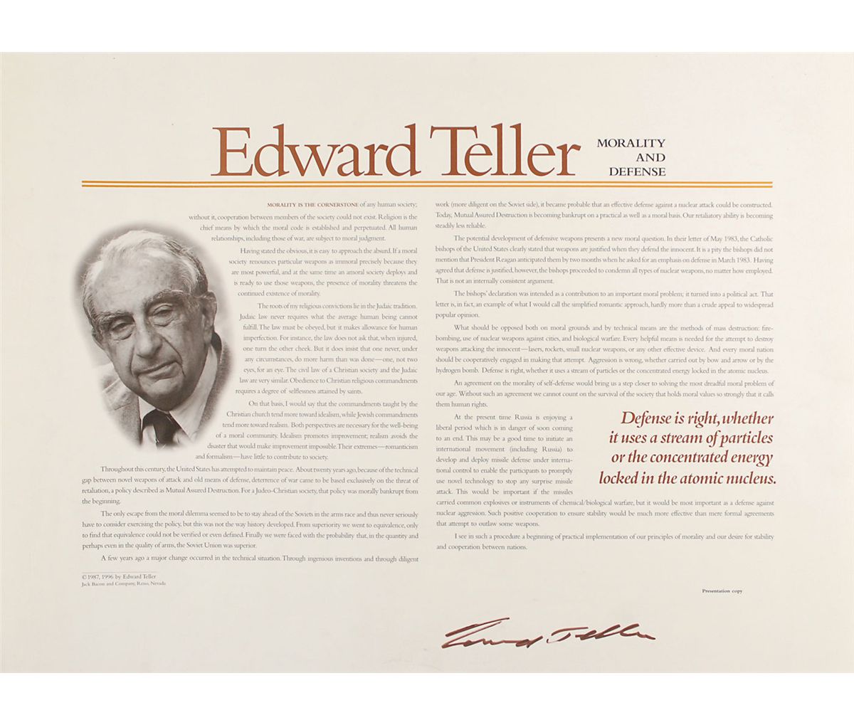 Limited edition 23.5 x 17 presentation print in the form of a large document entitled Morality and Defense, signed at the bottom in black felt tip. In fine condition.