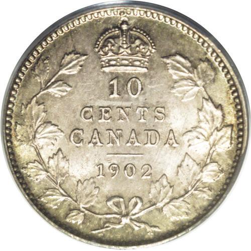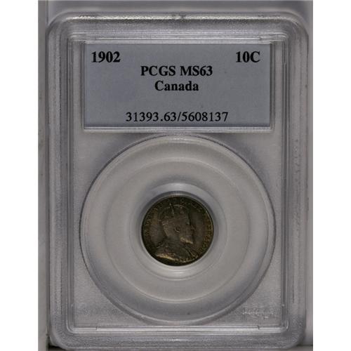 <B>Edward VII 10 Cents 1902, </B></I>KM10, MS63 PCGS, very attractively toned and rare in this desirable quality.<BR><I>From the Dominion Collection.</B></I>
