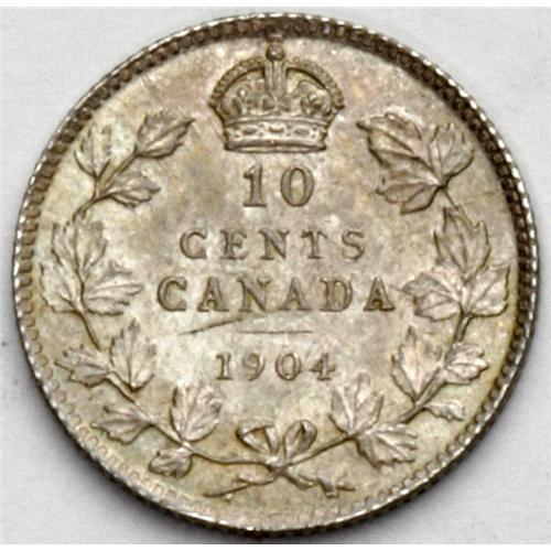 <B>Edward VII 10 Cents 1904,</B></I> KM10, a nice AU that exhibits lots of luster on this tougher date Edward 10 cent piece.