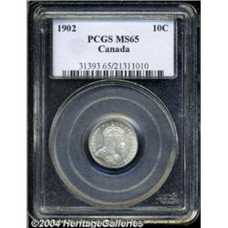 Edward VII 10 cent 1902, KM10, MS65 PCGS, fully brilliant and white, one of the finest certified examples of this date. Only three pieces have been certified in MS65 by PCGS, with none finer.From the Chet Krause Collection. Important notice: Heritage usually auctions material at the rate of 200-250 lots per hour. On some occasions eBay Live bid software or the Internet may not be able to keep up with the pace of the auction. We recommend placing a realistic absentee bid now as insurance to avoid disappointment. Occasionally the auctioneer may eliminate or reject an eBay Live bid, and the auctioneer may also reopen a lot after the close of the eBay live bidding (usually because we missed an audience bid), and may reject your bid even if it shows you as the winning bidder. By bidding via eBay Live, you agree that Heritage may award the lot to another bidder at its sole discretion under the circumstances described above or any other reasonable circumstances. Also please note that all Heritage lots purchased through eBay Live carry a 20% Buyer's Premium. Please make sure you read the Terms and Conditions before you bid.