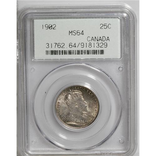 <B>Edward VII 25 Cents 1902,</B></I> KM11, MS64 PCGS. This first-year issue is well struck and lustrous with green and gray patina.<BR><I>From the Dominion Collection.</B></I>