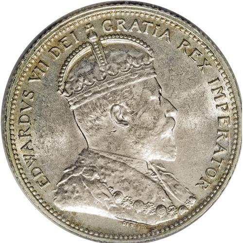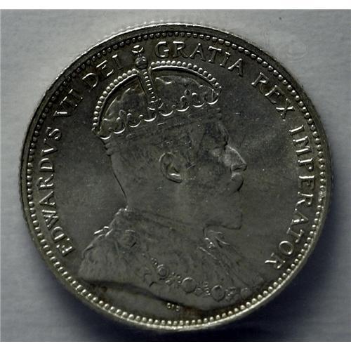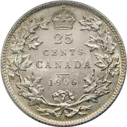 <B>Edward VII 25 Cents 1906 Large Crown,</B></I> KM11, MS63 ICCS. Brilliant white with a sharp strike and a few light obverse abrasions.<BR><I>From the Dominion Collection.</B></I>