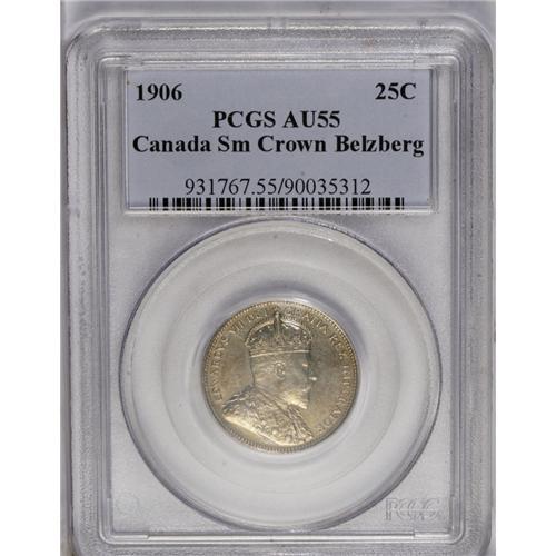 <B>Edward VII 25 Cents 1906 Small Crown,</B></I> Ex: Belzberg Collection, KM11, AU55 PCGS. Abundant remaining luster with a touch of golden toning. One of the great rarities of the Canadian series that has only come to light in recent years. In 1906 the reverse was re-designed to improve the look, and life span of the issue. In doing this, the crown was made larger and the leaves re-designed. A small number of 1906 25 Cents were produced using the old reverse dies. The Small Crown variety is rarely found above VG with about 75% of the known examples in VG, or worse condition. Only one piece has been certified in Mint State.<BR><I>From the Dominion Collection.</B></I>