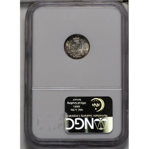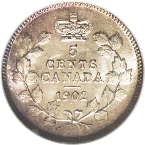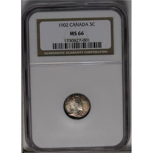 <B>Edward VII 5 Cents 1902,</B></I> KM9, MS66 NGC. Fully lustrous and well struck with gold and steel-blue peripheral toning.