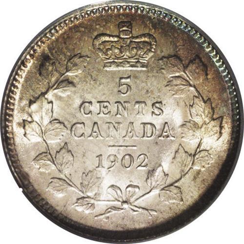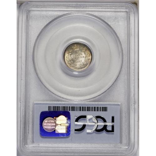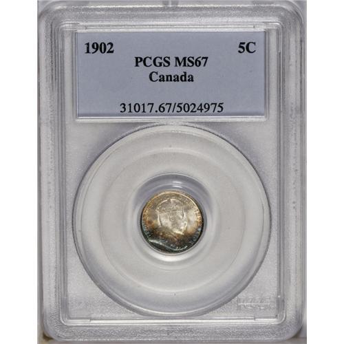 <B>Edward VII 5 Cents 1902,</B></I> KM9, MS67 PCGS. A second Superb example of the first-year issue. This piece has golden toning with a splash of steel-blue on the obverse.<BR><I>From the Dominion Collection.</B></I>
