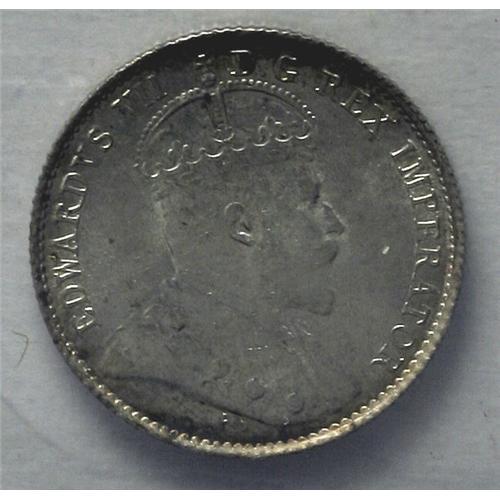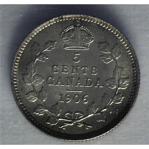 <B>Edward VII 5 Cents 1906,</B></I> KM13, MS63 Repunched 6 ICCS. Light golden toning with an adequate strike. Although not listed in Charlton as a variety, the repunching of the 6 is quite obvious and an interesting variety.<BR><I>From the Dominion Collection.</B></I>