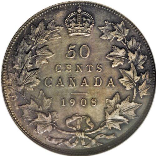 <B>Edward VII 50 Cents 1908,</B></I> KM12, Specimen 61 NGC. Gray-brown toning with a bold strike as normal for the Specimen issues. Although hairlines are visible on the reverse, a grade of MS61 seems to be a bit harsh.