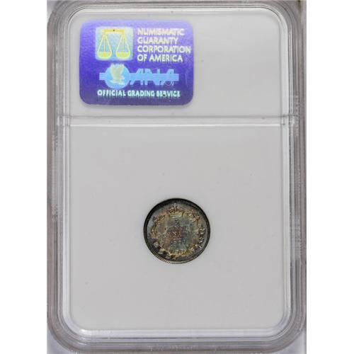 <B>Edward VII 5 Cents 1909 Round (Maple) Leaves,</B></I> KM13, MS67 NGC. Boldly struck with eye-catching gold, steel-blue, steel-gray, and sea-green target toning on the obverse, with steel-gray, gold and steel-blue toning on the reverse. This piece, and the following lot, are definitely two of the finer certified coins of this variety.<BR><I>From the Dominion Collection.</B></I>