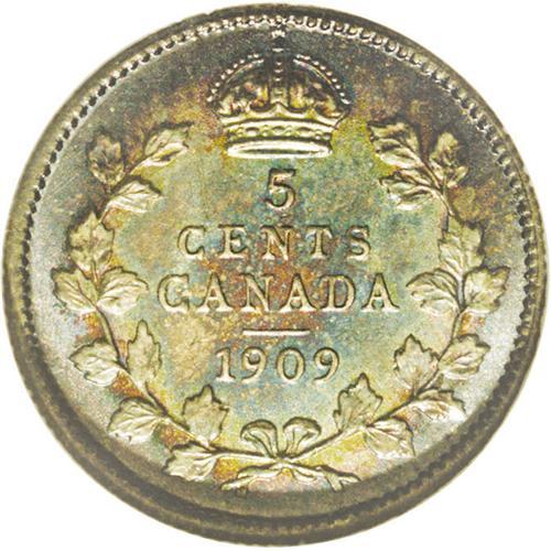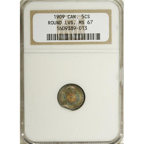 <B>Edward VII 5 Cents 1909 Round (Maple) Leaves,</B></I> KM13, MS67 NGC. Boldly struck with eye-catching gold, blue and sea-green toning. Among the finer certified coins of this variety.<BR><I>From the Dominion Collection.</B></I><BR><BR><b>Shipping:</b> Coin/Currency (<a target="_blank" href="http://www.heritageauctions.com/common/shipping.php">view shipping information</a>)