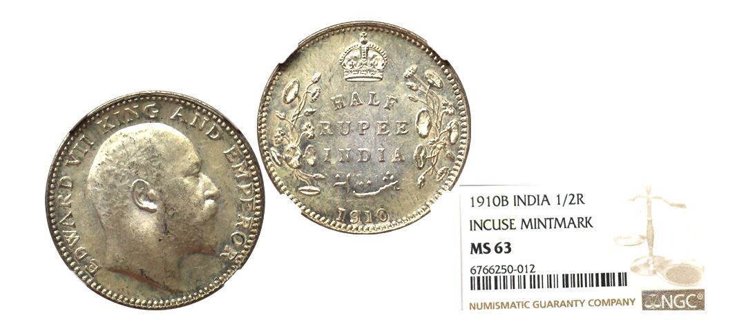 Edward VII, Silver 1/2 Rupee, 1910, Bombay Mint, B Incuse, NGC Graded as MS63, Very rare in grade.