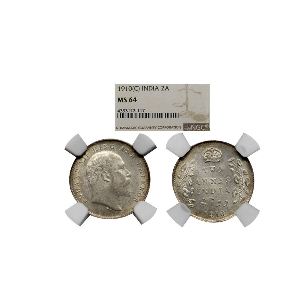 Edward VII, Silver 2 Annas, 1910, Calcutta Mint, Graded by NGC as MS 64, very rare.
