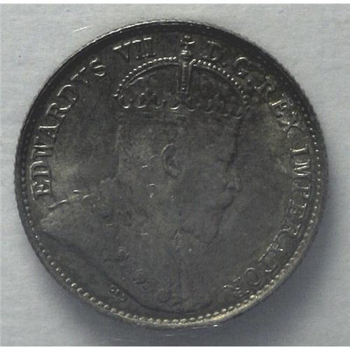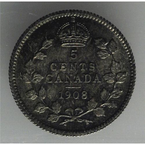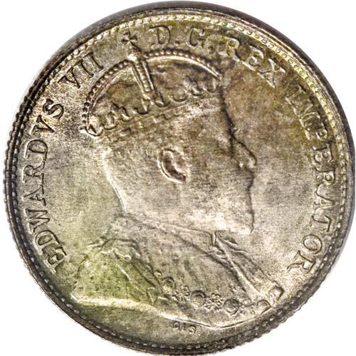 <B>Edward VII 5 Cents 1908 Small 8,</B></I> KM13 MS66 ICCS. Well struck for the issue. Superb steel-gray toning with rose and green undertones. ICCS has not attributed the variety on this coin. In the pieces for which they have attributed a variety, they have certified one example in MS66 with none finer. This piece is nicer than the Belzberg coin which was a PCGS MS65 without the wonderful color.<BR><I>From the Dominion Collection.</B></I>