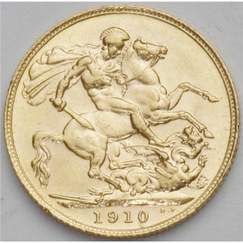 <B>Edward VII Sovereign 1910C,</B></I> KM14, an AU example with lots of luster and some contact marks typical with 22 carat gold coins.