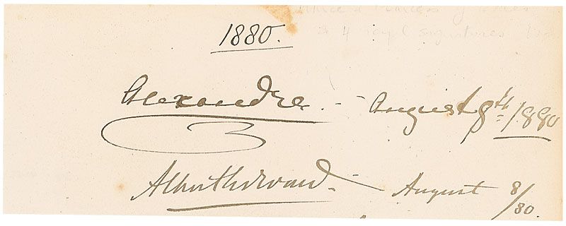 Prince of Wales and first British monarch of the House of Saxe-Coburg and Gotha, Edward’s reign (1901–1910) was named the Edwardian era. Ink signatures, “Alexandra—August 8th, 1880,” and “Albert Edward, August 8/80,” on an off-white 7 x 2.75 off-white slip. In fine condition, with a bit of scattered light toning and light pencil remnants along top edge. Accompanied by two unsigned cartes-de-visite.