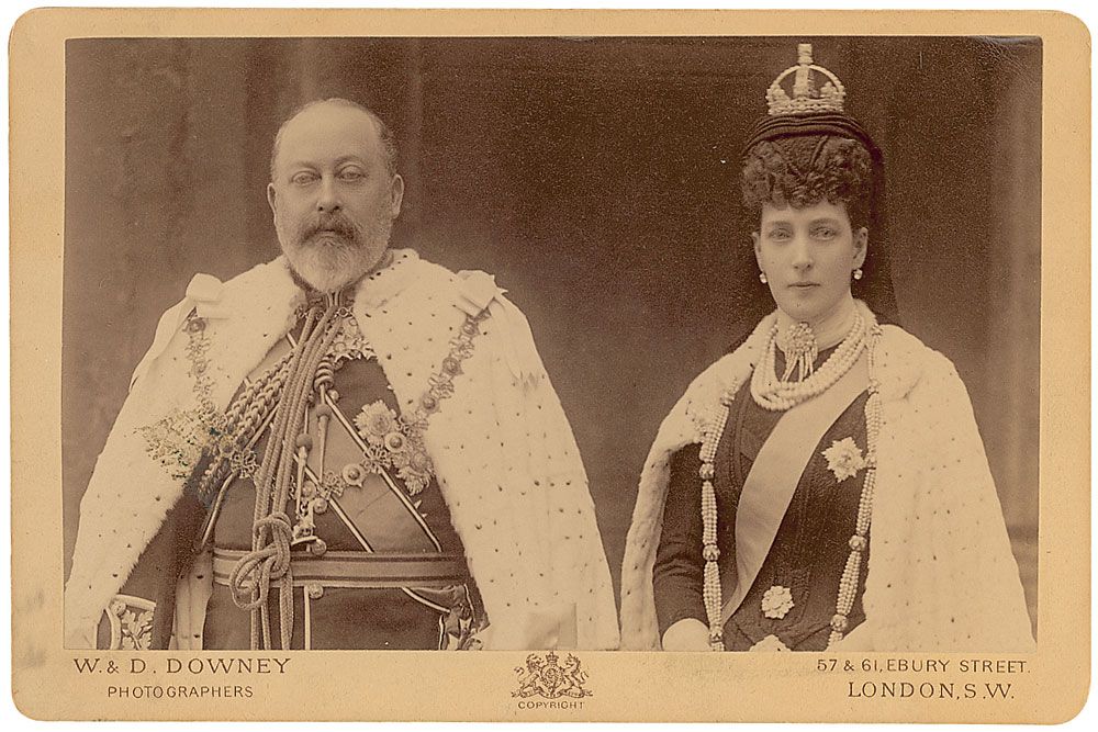 Original 6.5 x 4.25 cabinet photo of Edward and Alexandra in their robes by W. and D. Downey of England. In fine condition, with a small spot of soiling to left side as well as a bit of light border toning.