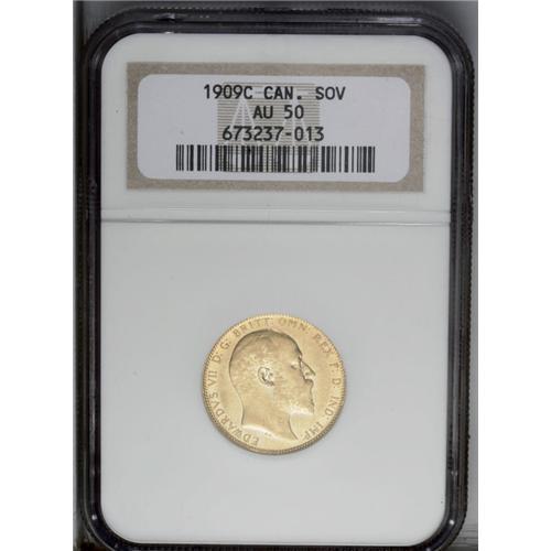 <B>Edward VII gold Sovereign 1909C, </B></I>KM14, AU50 NGC, a nice lustrous example.<BR><BR><b>Shipping:</b> Coin/Currency (<a target="_blank" href="http://www.heritageauctions.com/common/shipping.php">view shipping information</a>)