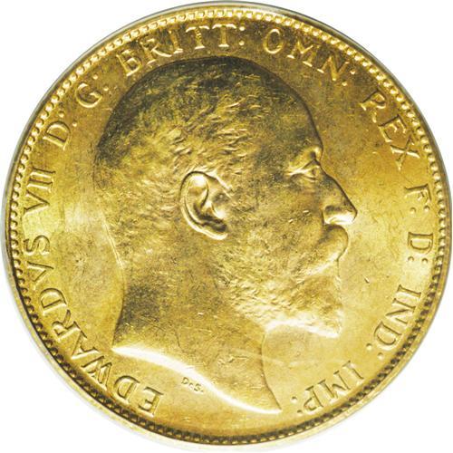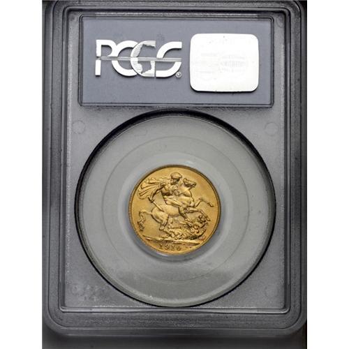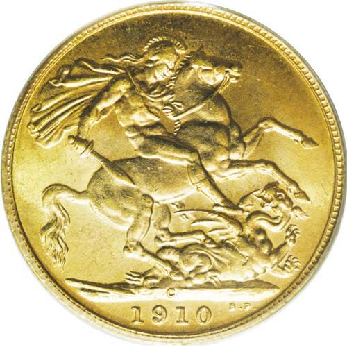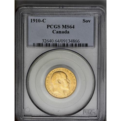 <B>Edward VII gold Sovereign 1910C, </B></I>KM14, MS64 PCGS, a choice example with full glowing mint luster and light original toning. Very rarely encountered in this lofty designation; only five coins have been graded MS64 by PCGS, and one nicer in MS65.<BR><I>From the Dominion Collection.</B></I>