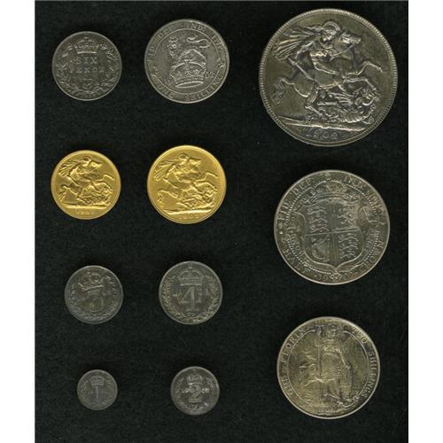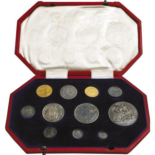 <B>Edward VII "short" Proof set, 1902. </B></I>A pleasing 11-piece set in an old purple velvet-lined red plush case, labeled "Specimen Coins 1902" in goldleaf with a crown. This is a nicer set than is usually seen and probably came from an old collection. The silver is all toned a similar rich gray with blue hues. The gold is original "hazy" looking with minimal hairlines. Consists of: gold sovereign and half-sovereign; silver crown, halfcrown, florin, shilling, sixpence, and four Maundy coins.