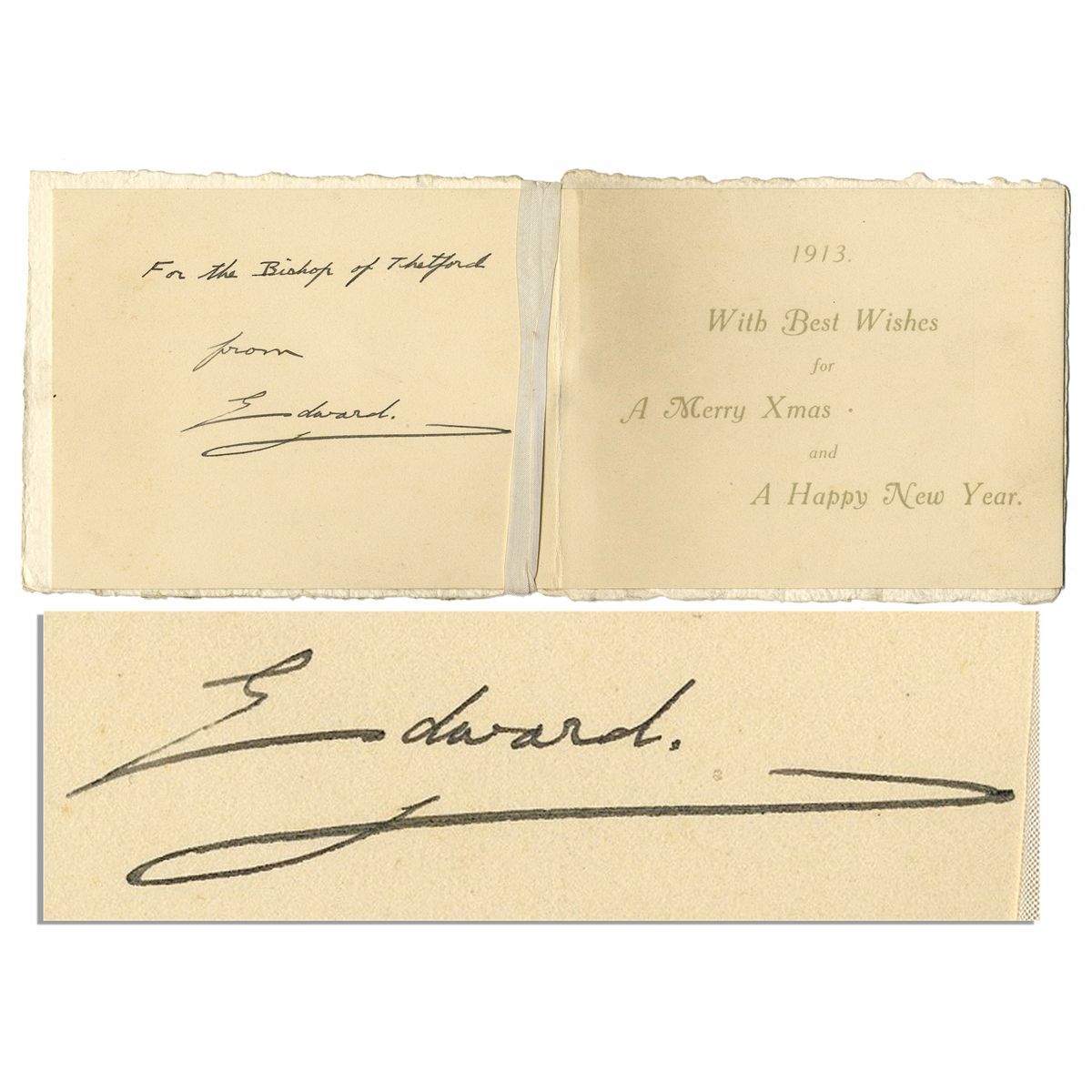Edward VIII 1913 Christmas card inscribed and signed as Prince of Wales. 4.5'' x 3.5'' card imprinted with seal of Magdalen College, Oxford, where Edward was a student, and bound with ribbon reads inside: ''…1913. With Best Wishes for A Merry Xmas and A Happy New Year…'' Inscribed in black ink: ''For the Bishop of Thetford from Edward.'' Envelope addressed to the Bishop is initialed by Edward with a penciled ''E'' in the corner. Light toning and soiling on card, moderate soiling on envelope. Overall very good condition.