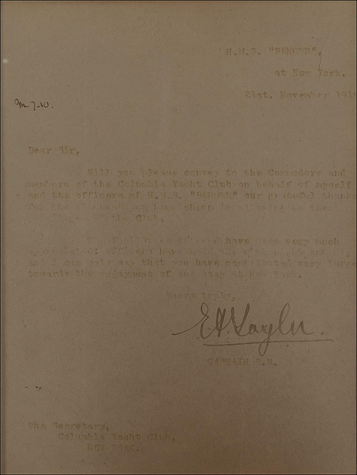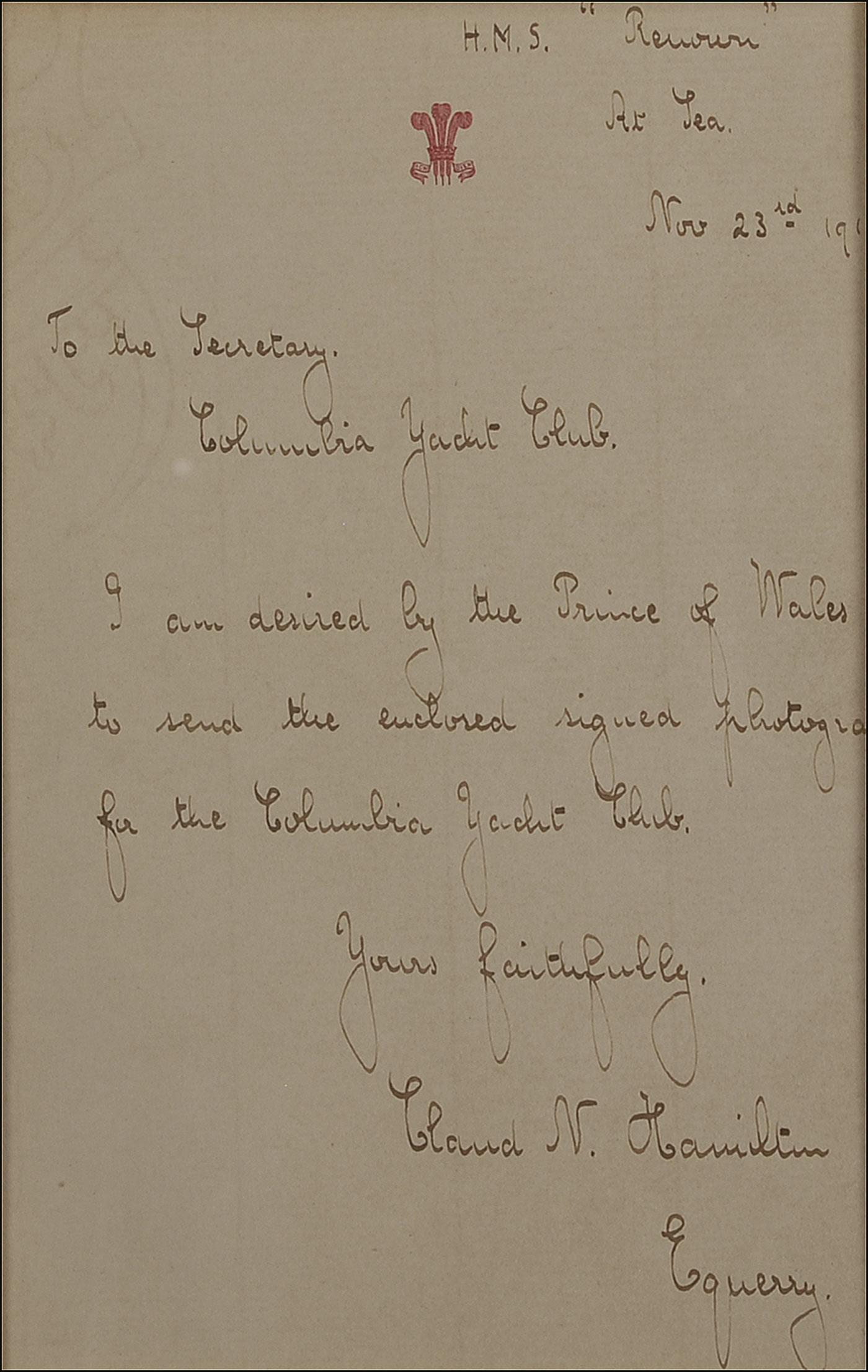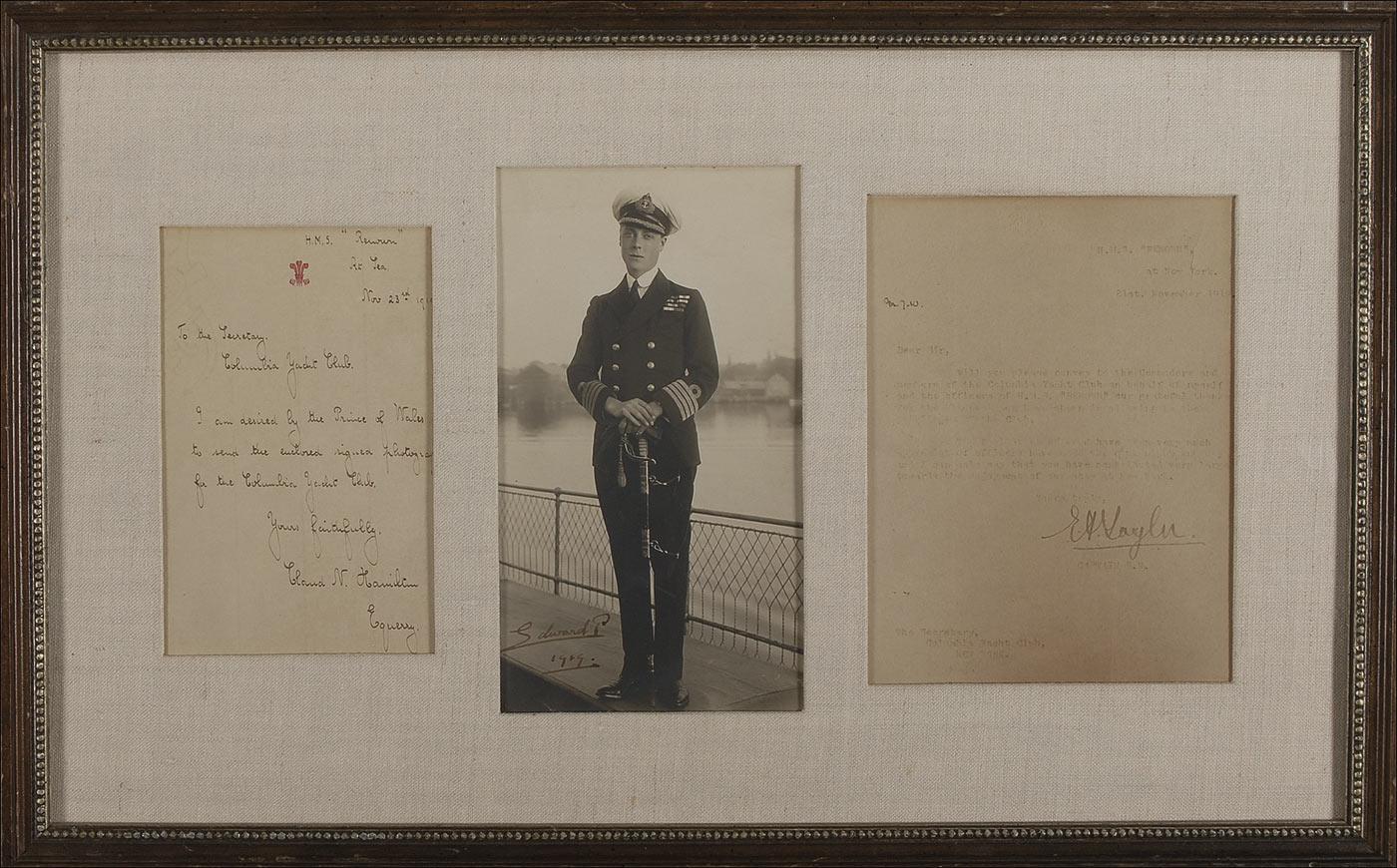 King of England from January to December 1936, at which time he abdicated the throne to marry American divorcée Wallis Warfield Simpson. Vintage matte-finish 5 x 9 full-length photo of Edward in his military uniform, signed in fountain pen, “Edward P 1919.” Cloth matted and framed with a November 21, 1919, TLS from the captain of the HMS Renown regarding the photo for the Columbia Yacht Club, as well as an ALS dated two days later forwarding the photo to the yacht club, to an overall size of 23.5 x 14.5. Some scattered light creases, primarily to background, and some light silvering to image, otherwise fine condition. Pre-certified PSA/DNA and RRAuction COA.
