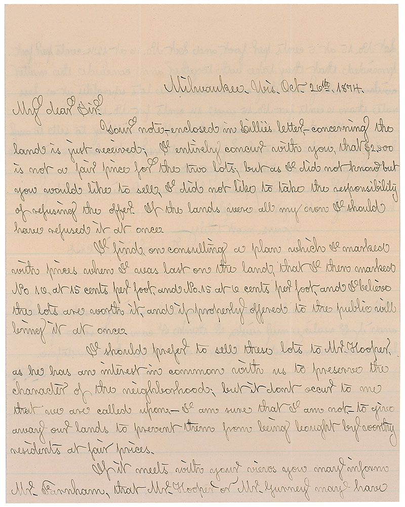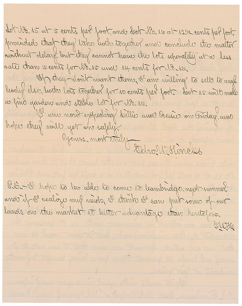 Career US Army officer who served as a brigadier general during the American Civil War and participated at Antietam and Petersburg (1830–1894). ALS signed “Edw. W. Hinks,” one page, lightly-lined both sides, 7.75 x 9.75, October 26, 1874. Letter to George Nichols. In part: “Your note enclosed…concerning the land is just received; I entirely concur with you, that $2500 is not a fair price for the two lots; but as I did not know but you would like to sell, I did not like to take the responsibility of refusing the offer. If the lands were all my own I should have refused it at once…I should prefer to sell these lots through Mr. Hooper as he has an interest in common with us to preserve the character of the neighborhood…I am sure that I am not to give away our lands to prevent them from being bought by worthy residents at fair prices.” Hinks also adds a short postscript, signing “EWH.” In fine condition, with intersecting folds (one through a single letter of signature). Accompanied by the original mailing envelope addressed in Hinks’s hand.