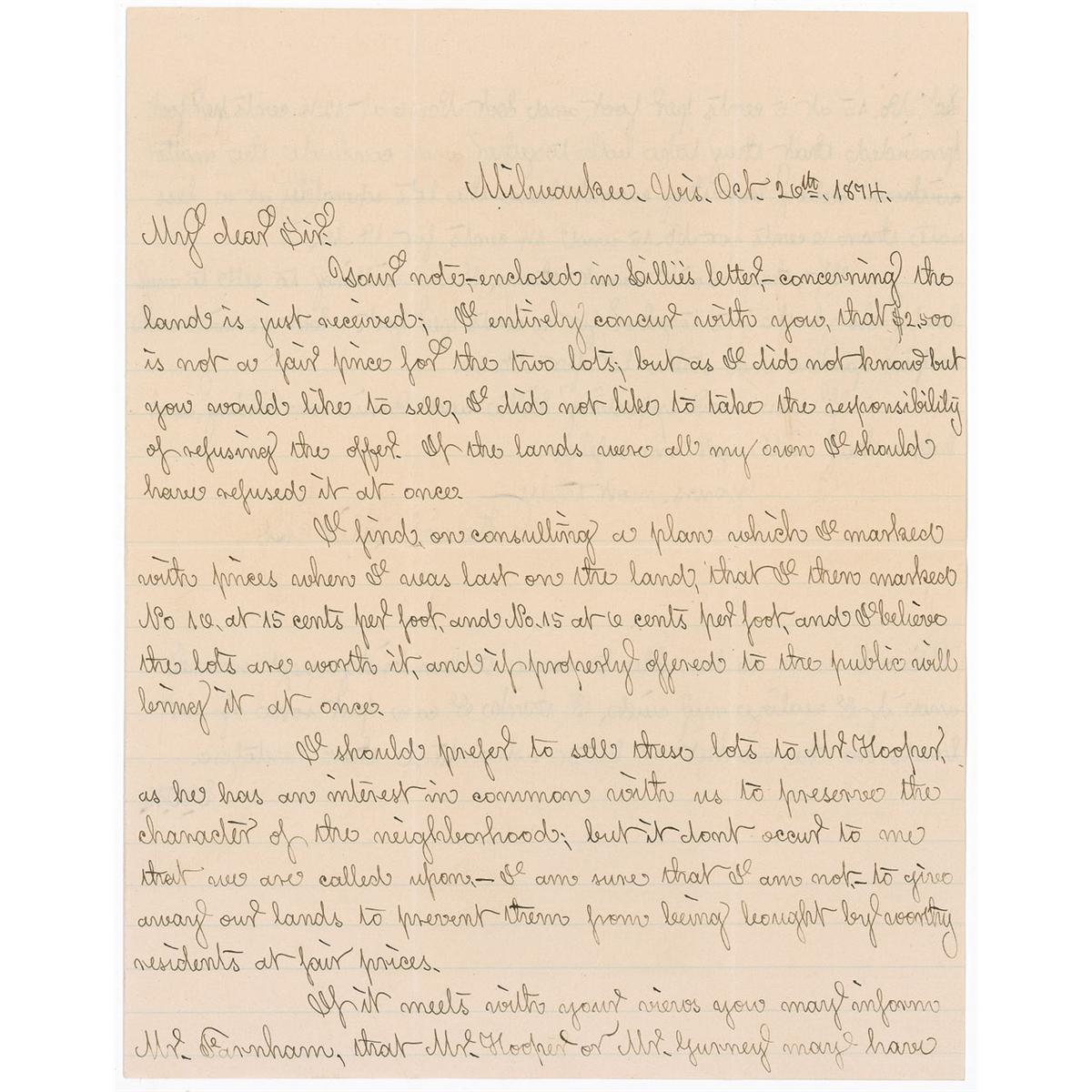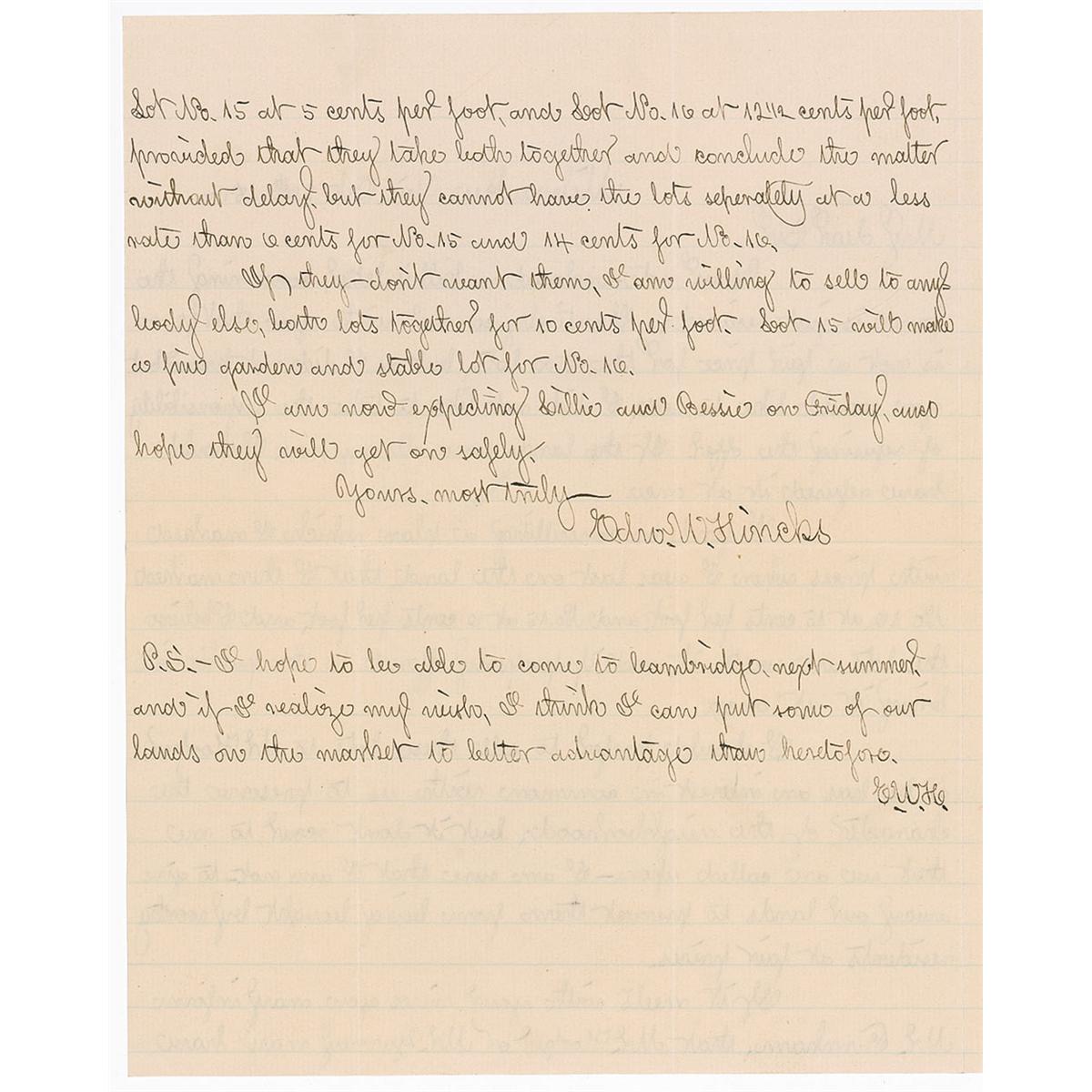 Career United States Army officer who served as a brigadier general during the American Civil War and participated at Antietam and Petersburg. ALS signed “Edw. W. Hinks,” one page, lightly-lined both sides, 7.75 x 9.75, October 26, 1874. Letter to George Nichols. In part: “Your note enclosed…concerning the land is just received; I entirely concur with you, that $2500 is not a fair price for the two lots; but as I did not know but you would like to sell, I did not like to take the responsibility of refusing the offer. If the lands were all my own I should have refused it at once…I should prefer to sell these lots through Mr. Hooper as he has an interest in common with us to preserve the character of the neighborhood…I am sure that I am not to give away our lands to prevent them from being bought by worthy residents at fair prices.” Hinks also adds a short postscript, signing “EWH.” In fine condition, with intersecting folds, one through a single letter of signature, and a uniform shade of mild toning. Accompanied by the original mailing envelope addressed in Hinks’s hand.