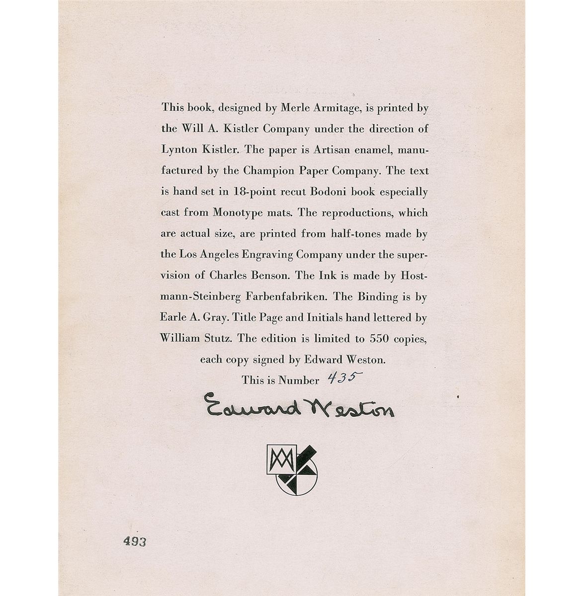 Tremendously innovative and influential 20th-century American photographer (1886–1958). Colophon page from a limited edition book of his work, numbered 435/550, 9.5 x 12, boldly signed in thick black ink. A bit of brushing to signature and light edge toning, otherwise fine condition.