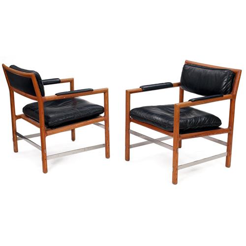 Edward Wormley armchairs, pair, by Dunbar, solid ash frames with stainless steel stretchers and original black leather upholstery, marked with brass D, original finish,25.25in.w x 27in.d x 32in.h,very good condition