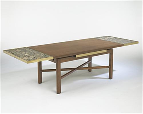 Measures 69 inches when fully extended. Signed with gold rectangular manufacturer's label and paper vendor's label to underside.