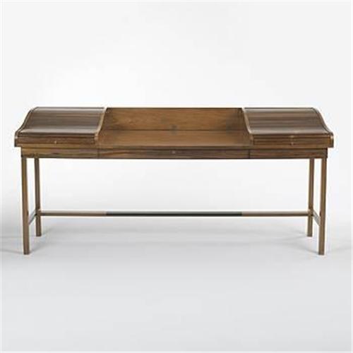 Edward Wormley desk Dunbar USA, c. 1965 mahogany, rosewood, brass, leather 74.5 w x 28 d x 35 h inches Featuring three drawers and two tambour doors concealing four drawers.