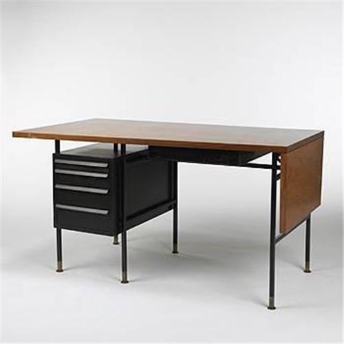 Edward Wormley<BR>drop-leaf writing table, model #5341<BR>Dunbar<BR>USA, c. 1949<BR>mahogany, walnut, enameled steel, brass<BR>54"w x 30"d x 29"h<BR>Green rectangular Dunbar label. Writing surface is 68" when fully extended.<BR>Literature: Dunbar: Fine Furniture of the 1950s, Pina, ppg. 196-197<BR><BR><BR><BR>